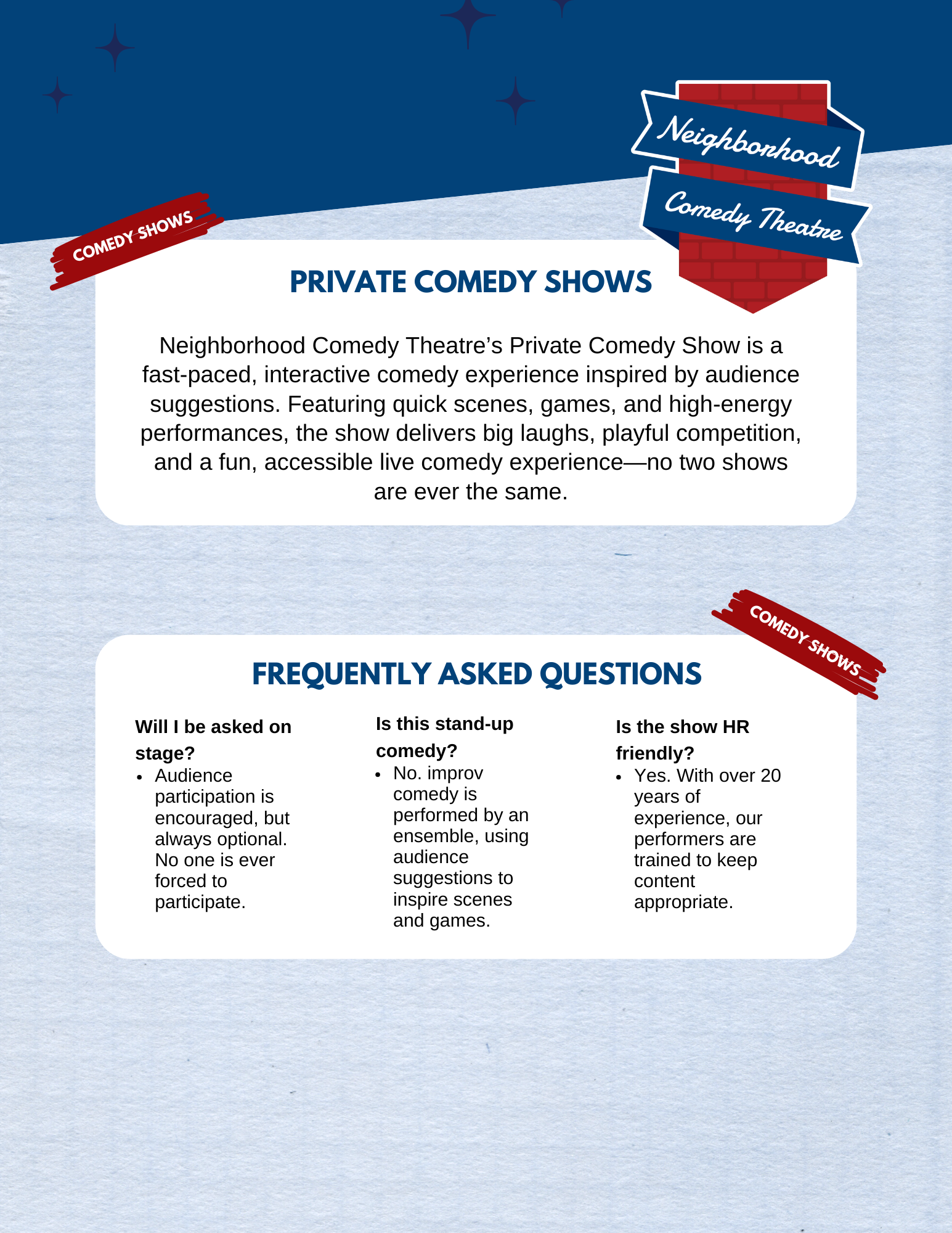 Neighborhood Comedy Theatre's Private Comedy Show is a fast-paced, interactive comedy experience inspired by audience suggestions. Featuring quick scenes, games, and high-energy performances, the show delivers big laughs, playful competition, and a fun, accessible live comedy experience no two shows are ever the same.