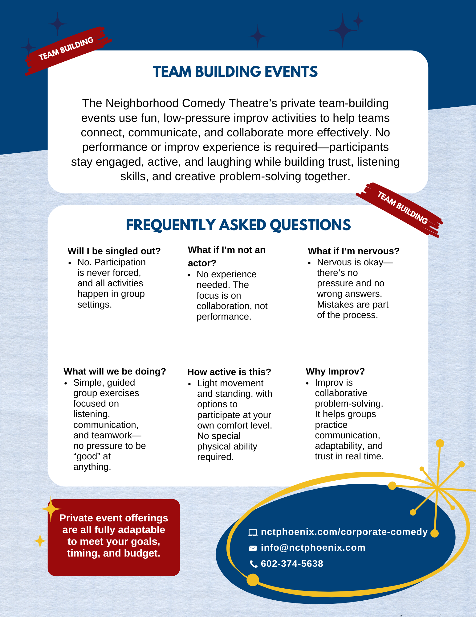 The Neighborhood Comedy Theatre's private team-building events use fun, low-pressure improv activities to help teams connect, communicate, and collaborate more effectively. No performance or improv experience is required--participants stay engaged, active, and laughing while building trust, listening skills, and creative problem-solving together.
